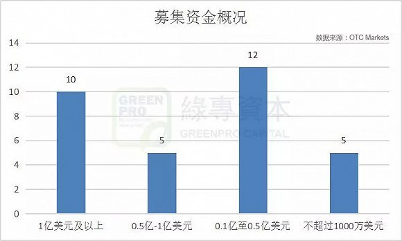 募集额方面,32家中国企业,共募资35.65亿美元(注:中指控股采取DPO方式上市,不涉及募集),平均每家募资 1.11 亿美元。具体来看,募资额超过1亿美元的有10家,0.5亿至1亿美元的有5家,0.1亿至0.5亿美元的有12家,不超过1000万美元的有5家。