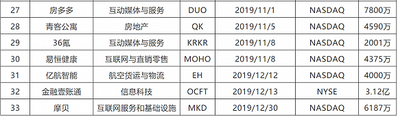 在发行地点上,33家中国公司中,有4家登陆纽交所,分别是:跟谁学、尚乘国际、网易有道和金融壹账通,其余29家均进入纳斯达克,(注:不包含美国OTC市场转板的中国企业)。