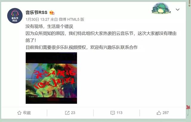 1月30日,演出资讯平台“音乐节RSS”开始着手组织“卧室POGO音乐节””,征集各个乐队的授权视频。乐迷在底下纷纷@自己喜爱的乐队,还有人急切催促:“快来授权!”。