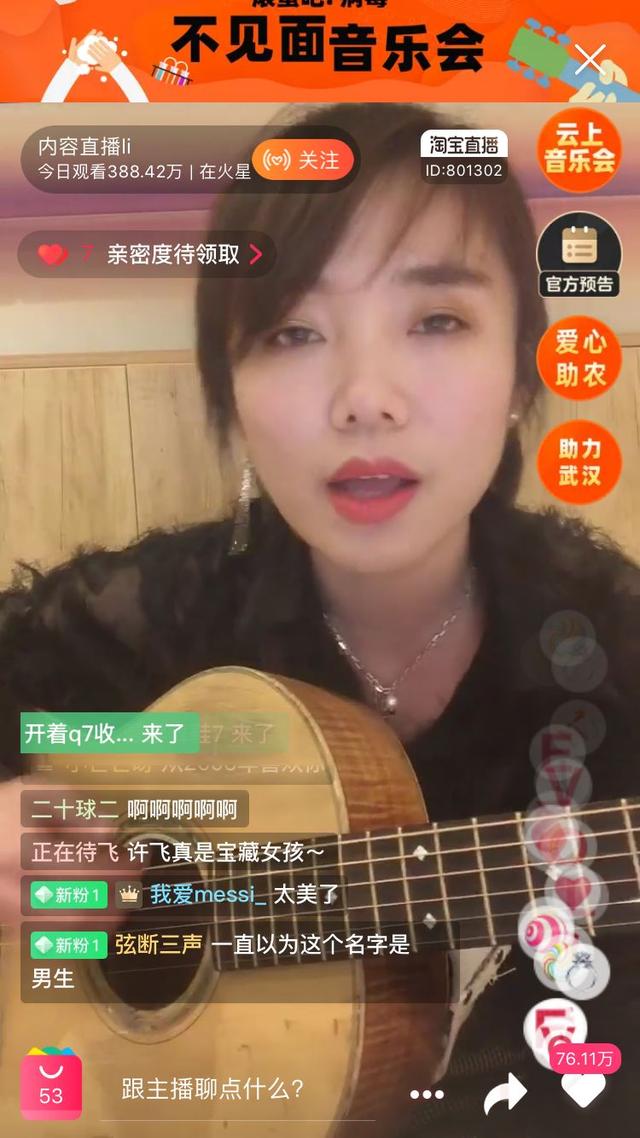 电商平台也加入了这场“蹦迪聚会”。情人节当晚,淘宝直播、阿里巴巴公益联合太合音乐、种子音乐和飒娱等,邀请薇娅和品冠、面孔乐队、阿杜、许飞、陆虎等21位嘉宾,发起“不见面音乐会”,为受困农户卖货、为一线医护人员募捐。直播获得了400万人在线观看,4个小时为一线医护人员募集到57万元,卖出76万斤农产品。