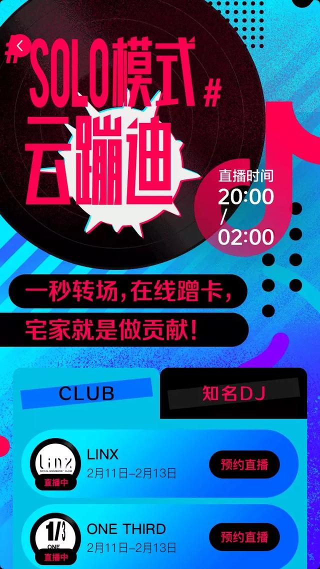 经过TAXX和OneThrid连续两天在抖音爆红,越来越多夜店在抖音开启直播。抖音也迅速联合LINX、PurpleBattery、TAXX等夜店,和JNK@JAY、LIZZY、NOVA等知名DJ,推出“#SOLO模式#云蹦迪”活动,在每个夜店的直播界面放置“云蹦迪”的活动链接,列出夜店与知名DJ的开播时间,用户可在页面内对预约感兴趣的直播进行预约。