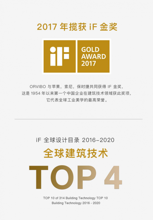 不仅如此,2017年,欧瑞博已成为在建筑技术品类第一个获得iF金奖的中国企业,同时获得此奖项的还有法拉利GTC4Lusso、 苹果Macbook Pro等,这是自1954年以来中国企业首次在BuildingTechnology领域亮相国际大奖舞台。可以说,欧瑞博获此殊荣,不仅填补了建筑技术领域中国公司的iF设计金奖空白,更开启了中国工业美学的新里程碑。