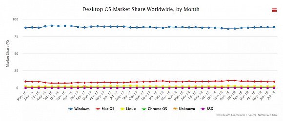 即使最近苹果的 MacOS 有了点儿起色,市场份额还是被微软压着。