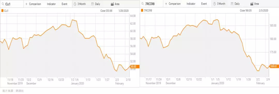 今年1月初,国内确认发现新型冠状病毒为致命病毒,随后证实可以人传人,由于担心疫情可能抑制中国市场需求,国际原油价格和大宗商品指数CRB一路下滑。1月初到2月11日,国际原油价格已经下滑20%左右,CRB指数下滑10%左右。