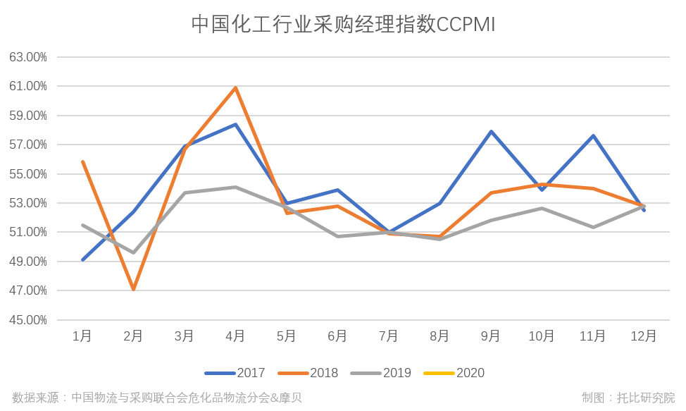 如果参考中国物流与采购联合会危化品物流分会与摩贝联合推出的中国化工行业采购经理指数(CCPMI),就会发现,1-2月份并不是国内化工行业经营活动的旺季,每年此时进入中国春节假期,经营活动有限;随后复工后的3-4月份却是一个经营活动强劲时段。(注:该指数以50%为分水岭:50%以上,反映化工行业经济扩张;低于50%,通常反映化工行业经济衰退)。如此看来,2月底化工企业能否按时复工、物流运输顺畅会直接影响到3-4月化工行业经济是否仍旧活跃。而这种情形是否到来,一方面要看国内疫情形势发展,另外一方面也要看政府和企业具体如何作为。