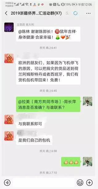 2月1日晚,浙江省侨界名媛汇微信群里的一则信息引起了大家的注意。“欧洲的朋友们,如果因为飞机停飞的原因,可以把捐灾的货品送到荷兰阿姆斯特丹或者西班牙,我们有货机包机带回来!免费!”群里瞬间沸腾,求助信息纷至沓来。省侨联党组书记、主席连小敏捕捉到这一信息,随即高度重视,求证确认后,第一时间研究讨论,展开部署。