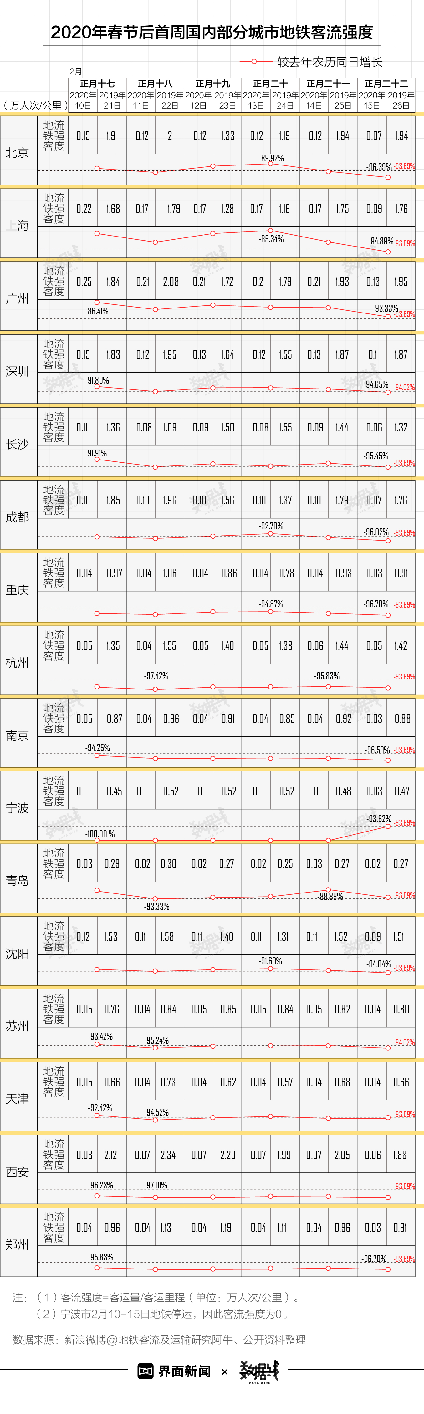 城市轨道交通方面,界面数据记者根据公开资料,将上述十六个城市2月10-15日的地铁客流强度,与去年农历同日客流强度对比。结果显示,十六个城市平均客流强度降幅达93.69%。