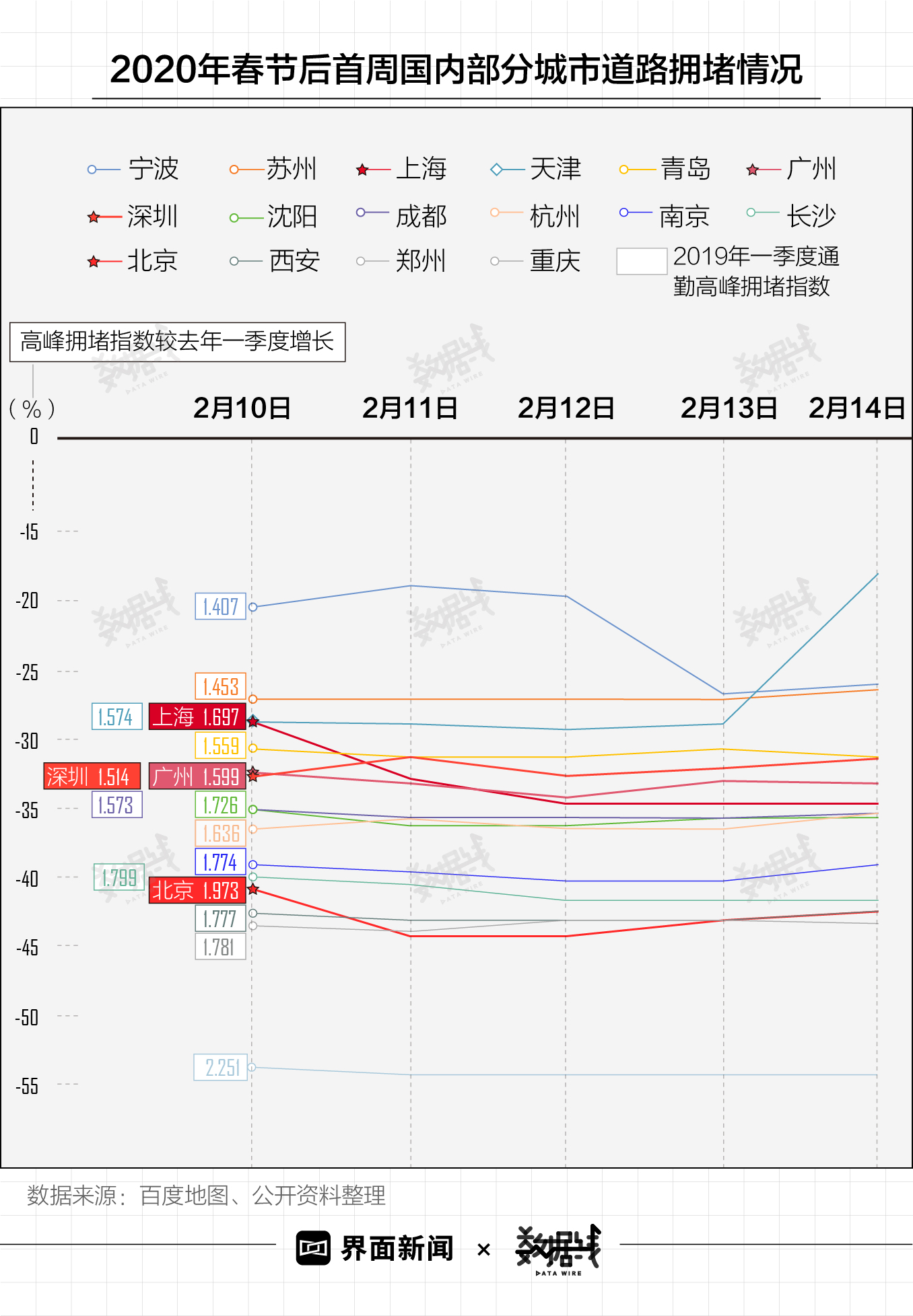 2月17日,《环球时报》题为《大多数城市不应再继续“静止”下去了》的评论称,“一个上千万人口的大城市因为每天很个别受到追踪的病例而让街道空荡荡的,对这种情况我们应当自嘲,并且打破之。”那么,复工首周各个城市出门的人到底多不多?
