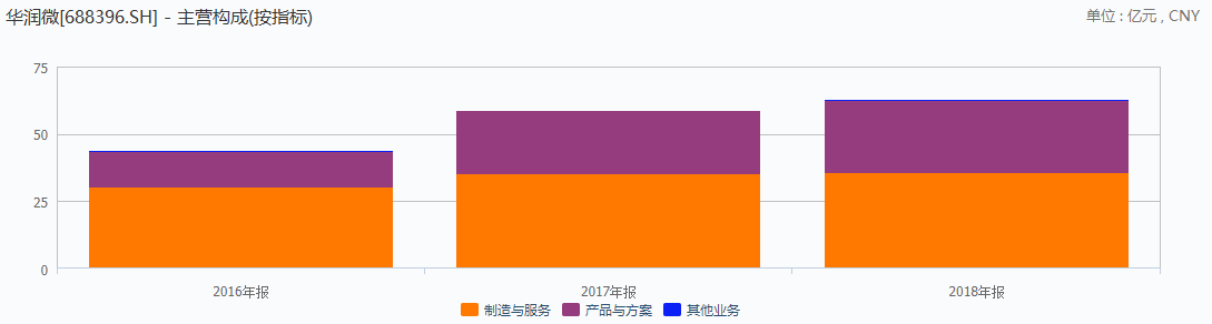 但需要指出的是,与上述几家A股的IDM公司不同,华润微并不是一家纯粹的IDM企业。以公司2018年营收为例,其中42.8%的收入来自产品与方案,即公司所说的IDM,还有57%的收入来自制造与服务。
