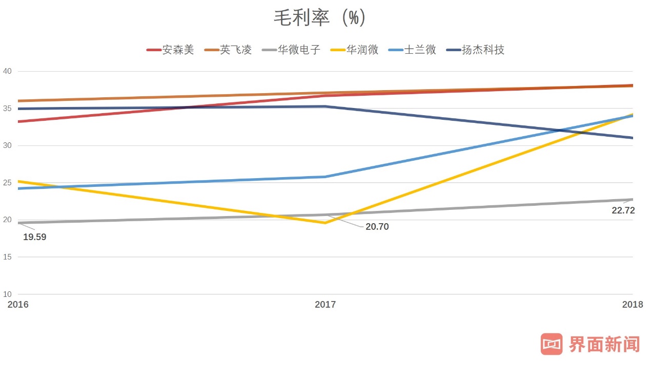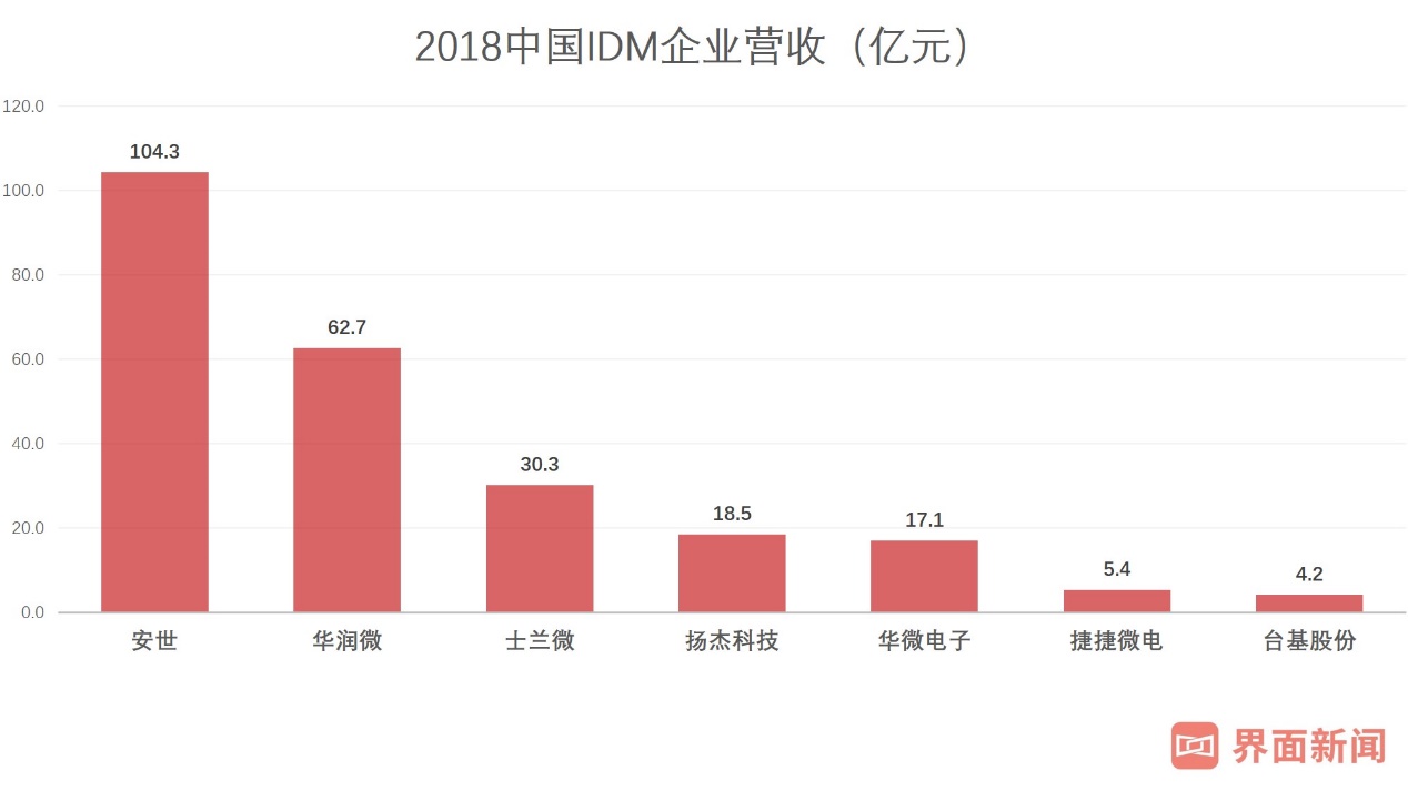 在过去相当长一段时间里,在中国芯片IDM领域,华润微的体量都是首屈一指。2018年,华润微实现营收62.7亿元,高于士兰微的30.3亿元,但低于安世的104.3亿元。