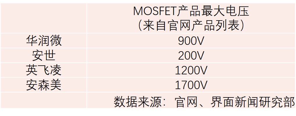 不过,界面新闻并未在华润微官网的产品列表中找到1500V的MOSFET产品,公司的DMOS场效应晶体管覆盖的电压最大只到900V,这可能更接近于公司实际对外销售的情况。
