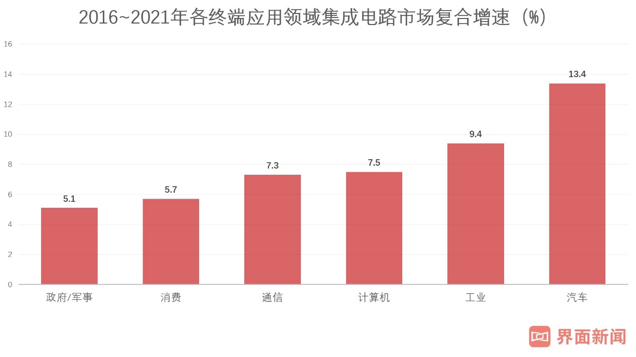 其次是汽车电子本身也是一个高速增长的市场,根据IC Insights的预测,在集成电路的各终端应用领域中,从2016到2021年,汽车的复合增速最快,达到13.4%。