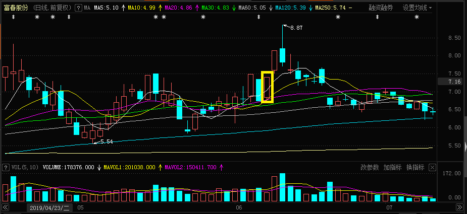 他比较典型的手法是去年6月份操作的富春股份,图中两连板的首板是就佛山帮做的,第2天也是跳空高开,有一个比较好的溢价,没有阴线砸下来对散户来说已经很友好了,通常利润在5%-10%之间是它典型的模式,但如果竞价被市场推得特别高,他可能会直接出货砸掉。(图中黄色框是首板)