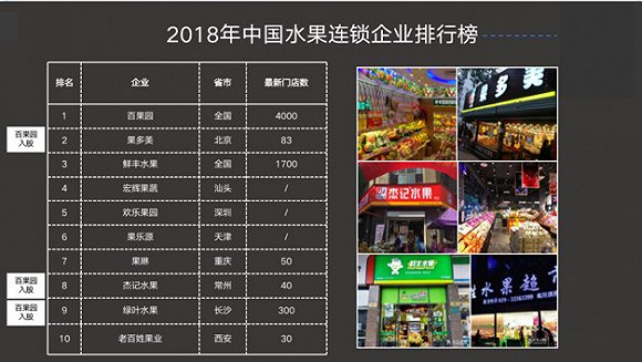 2018年整个中国水果连锁企业的排行榜上,百果园是第一,它收购的果多美是第二。后面的第八、第九名百果园通过投资方式完成整合。
