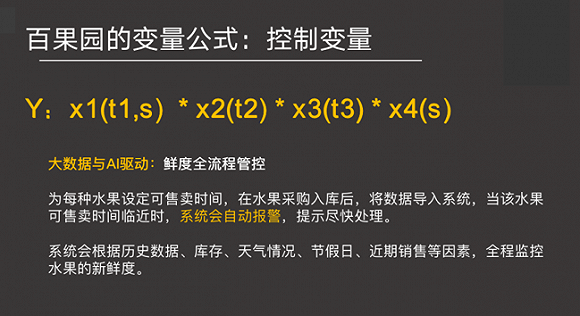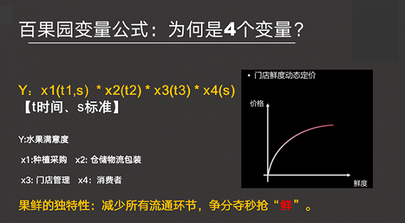 百果园给自己做了这样一个公式:如果把Y定义成最终消费者的体验,那么Y是由哪些变量影响呢?是由x1、x2、x3、x4四个变量影响的。每一个x背后还有两个变量【t时间、s产品标准】。