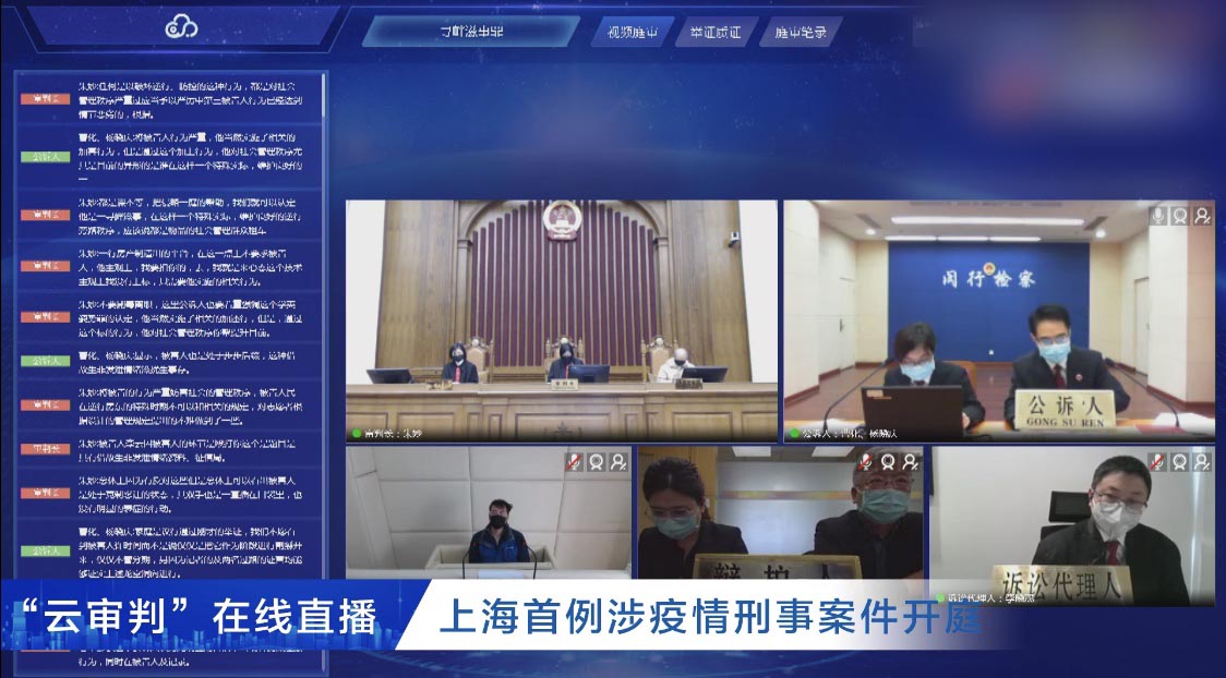 为配合防疫要求,避免聚集性感染,控辩双方均通过网络参加庭审。此次的网络审理直播上共有5个画面框,分别为合议庭、公诉人、诉讼代理人、辩护人和被告。控辩双方均通过网络参加庭审。尽管是网络庭审,但所有参与庭审的双方均整齐划一地佩戴好口罩。