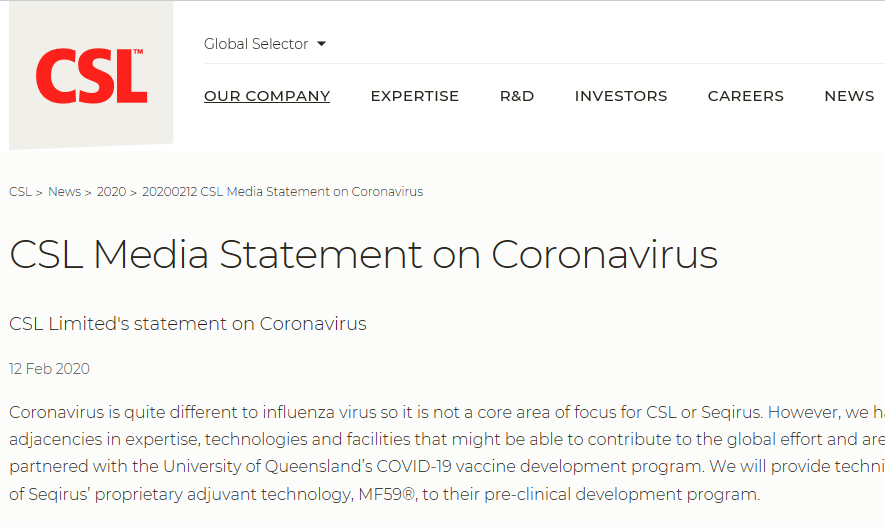 除了彼得·多尔蒂研究所,血浆衍生品、流感疫苗和细胞培养试剂生产巨头CSL也发表声明称,已经和昆士兰大学的新型冠状病毒疫苗计划达成合作关系。成立于1916年的CSL早先为澳大利亚联邦血清实验室,专注于疫苗研制。