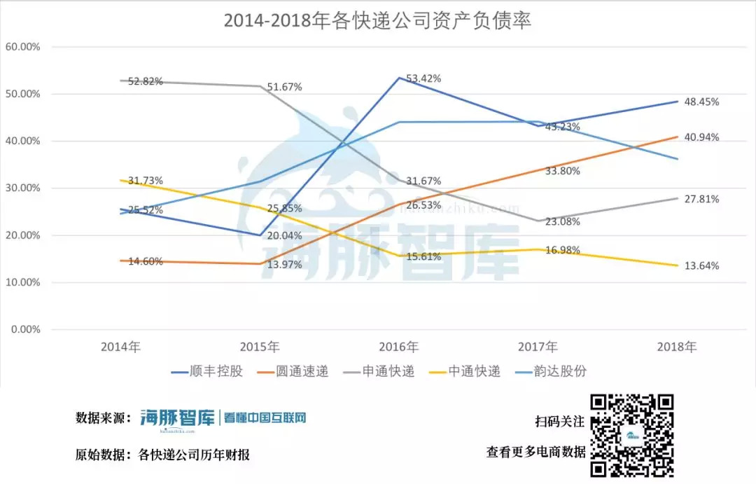 2014-2018年各快递公司资产负债率,数据来源 :各快递公司历年财报 海豚智库整理