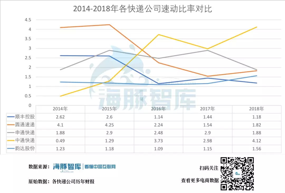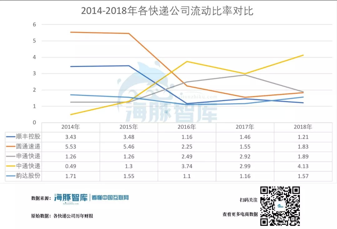 2014-2018年各快递公司流动比率,数据来源:各快递公司历年财报 海豚智库整理