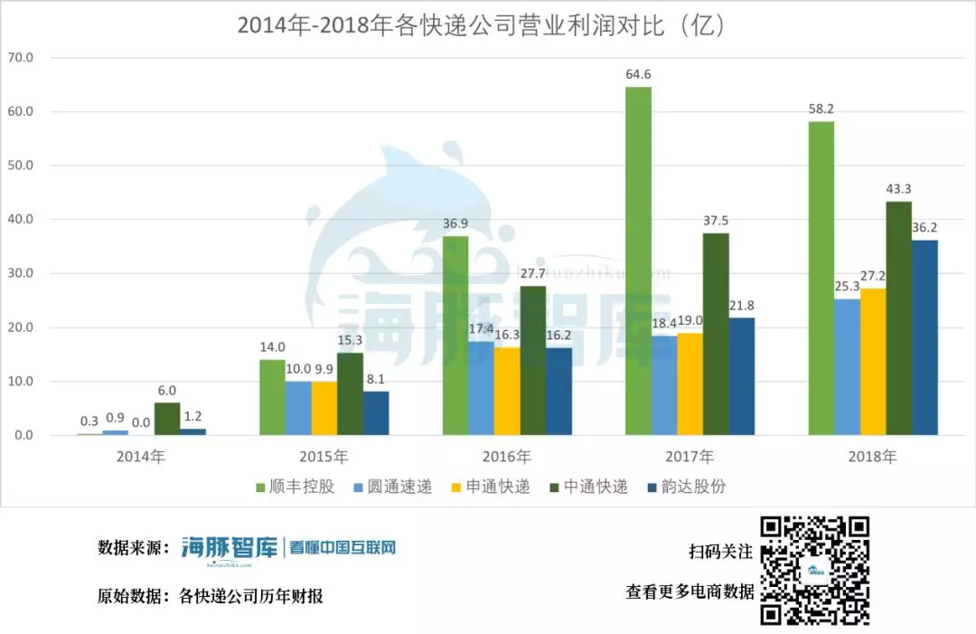 2014-2018年各快递公司营业利润,各快递公司历年财报 海豚智库整理