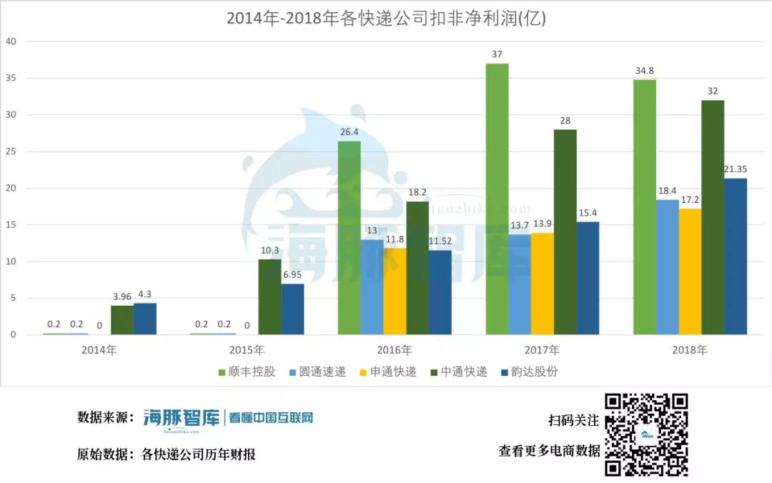2014-2018年各快递公司扣非净利润,各快递公司历年财报 海豚智库整理