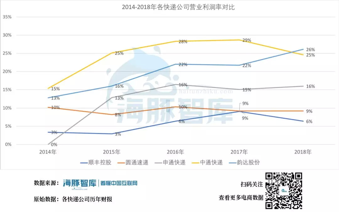 2014-2018年各快递公司营业利润率,各快递公司历年财报 海豚智库整理