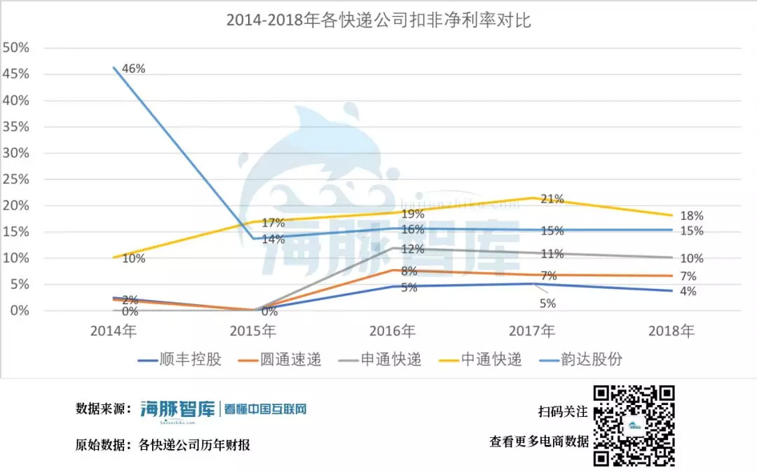 2014-2018年各快递公司扣非净利率,各快递公司历年财报 海豚智库整理