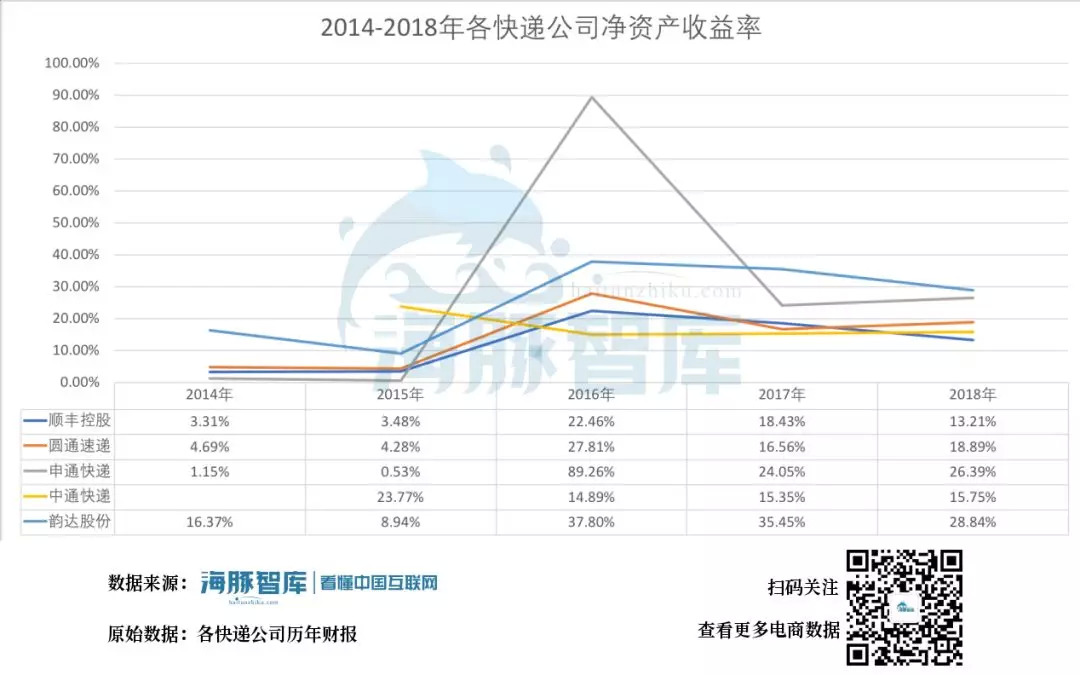 2014-2018年各快递公司净资产收益率,各快递公司历年财报 海豚智库整理