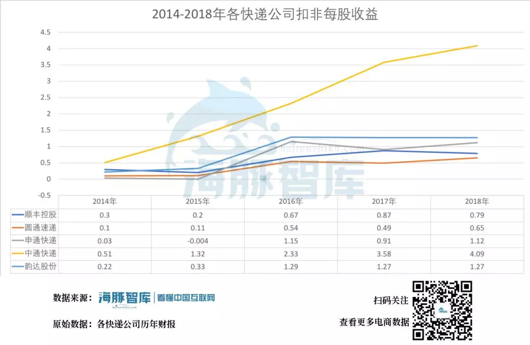 2014-2018年各快递公司扣非每股收益,各快递公司历年财报 海豚智库整理