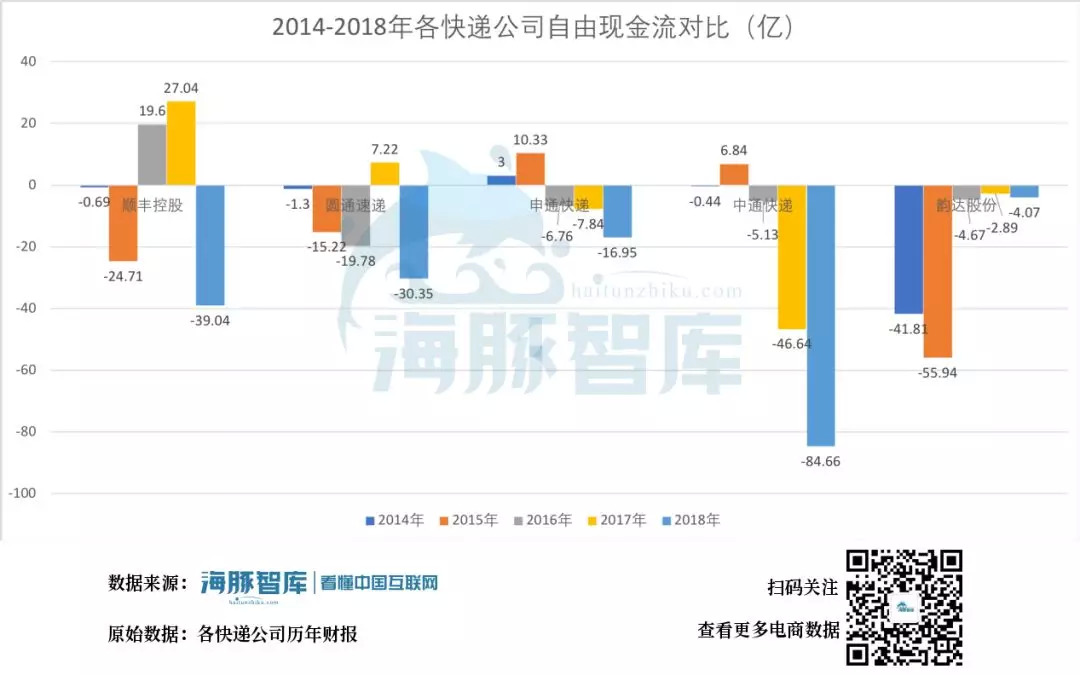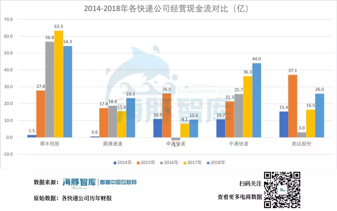 通过比较,看18年的数据,顺丰的经营现金流是最多的,54.3亿,中通排第二,44亿且经营现金流明显越来越高,申通是最少的,10.6亿。