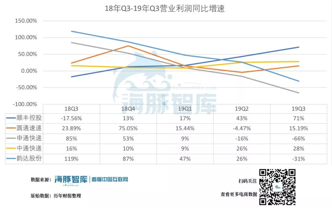 18年Q3-19Q3营业利润增速对比,历年财报整理 海豚智库整理