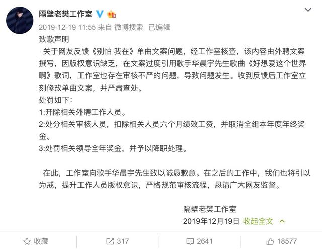在质疑发生后,"隔壁老樊工作室"也在微博上发了致歉声明,说明了抄袭争议的来龙去脉。工作室在微博中提到,单曲文案由外聘文案撰写,过度引用了华晨宇《好想爱这个世界》的歌词作为介绍,因工作室审核不严导致问题发生,随后对相关人员做了处理。