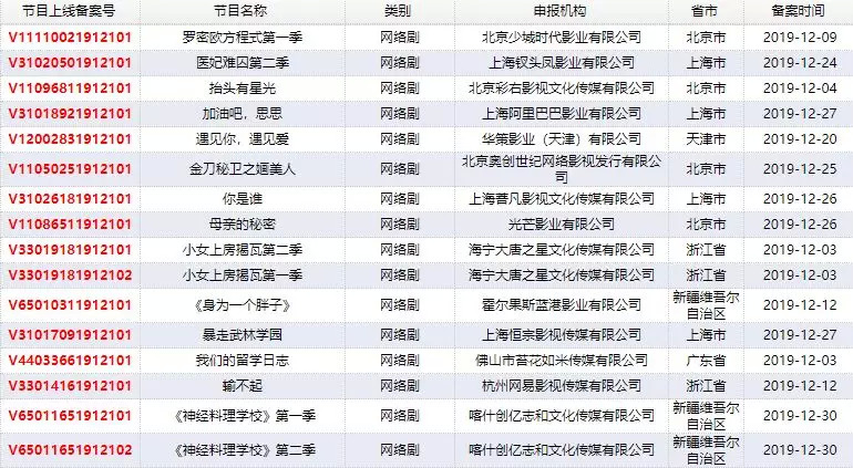 2月12日,广电总局公布了2019年12月重点网络影视剧规划备案情况,其中通过规划备案的网络剧为102部,共2520集。