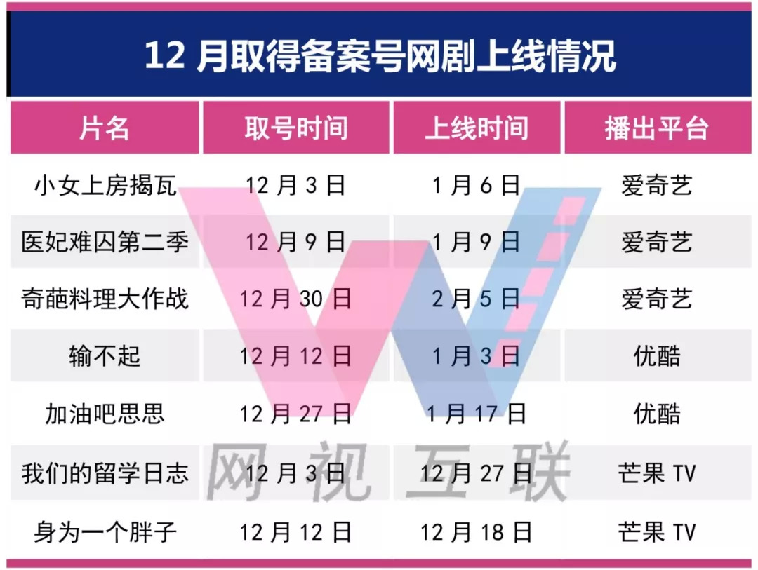 虽然规划过审数量有所下降,但上线过审数量略有提升,12月份取得上线备案号的网剧有16部,更重要的是,这些网剧有一半以上已经在视频网站上线。