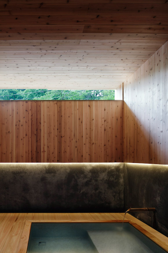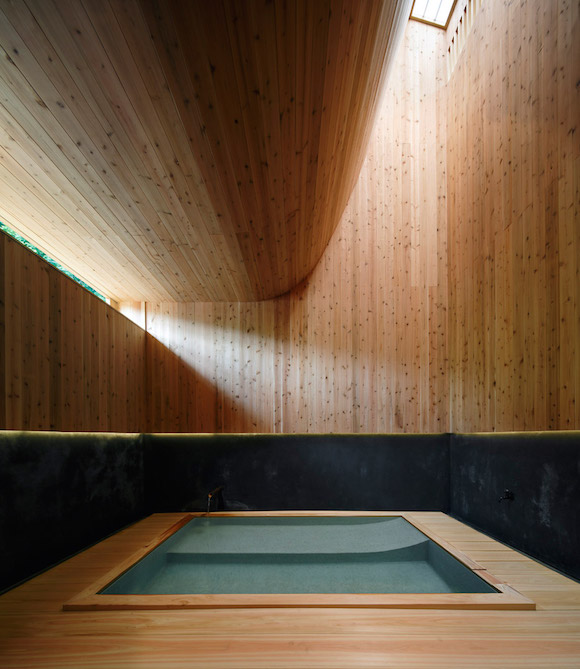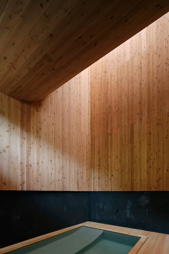 “通过计算设计的曲面可以使得浴室有个最合理的开口,保证通风、保证采光,而且外面吹进的冷风可以被温泉的热气烘热,然后再飘出浴室去。”浴室的设计方Kubo Tsushima事务所在接受设计网站Dezeen采访时说。当然,现在的开口也完美保证了隐私。