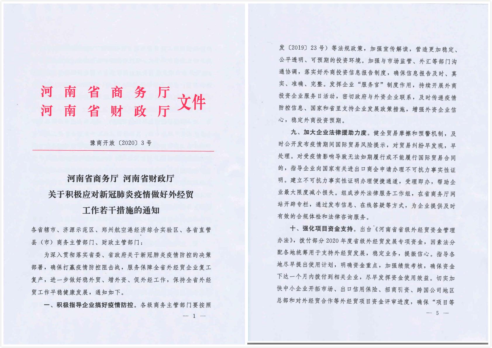 财联社记者获悉,河南省商务厅、省财政厅联合发文,出台13条措施服务保障全省外经贸企业复工复产。在强化项目资金支持方面,将出台《河南省省级外经贸资金管理办法》,拨付部分2020年度省级外经贸发展专项资金,因素法分配各地统筹用于支持外经贸发展;指导各地尽早提出使用计划,确保资金下达一个月内拨付到相关企业;切实加快中小企业开拓市场、出口信用保险、招商引资、跨国公司地区总部和对外经贸合作等外经贸项目资金评审进度,确保“项目等资金”。