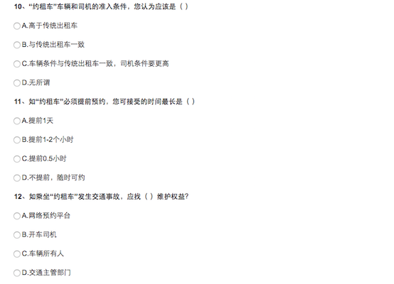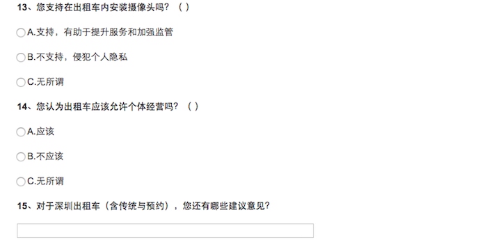 除就网络约租车管理方案发布招标公告外,从9月23日起,深圳市交委还在其官网发布《2015年深圳市出租车消费者市场调查问卷》。这份问卷总共15个问题,其中就有6题涉及“专车”内容,包括专车与出租车的关系、专车运价和数量、专车车辆和司机准入条件等。