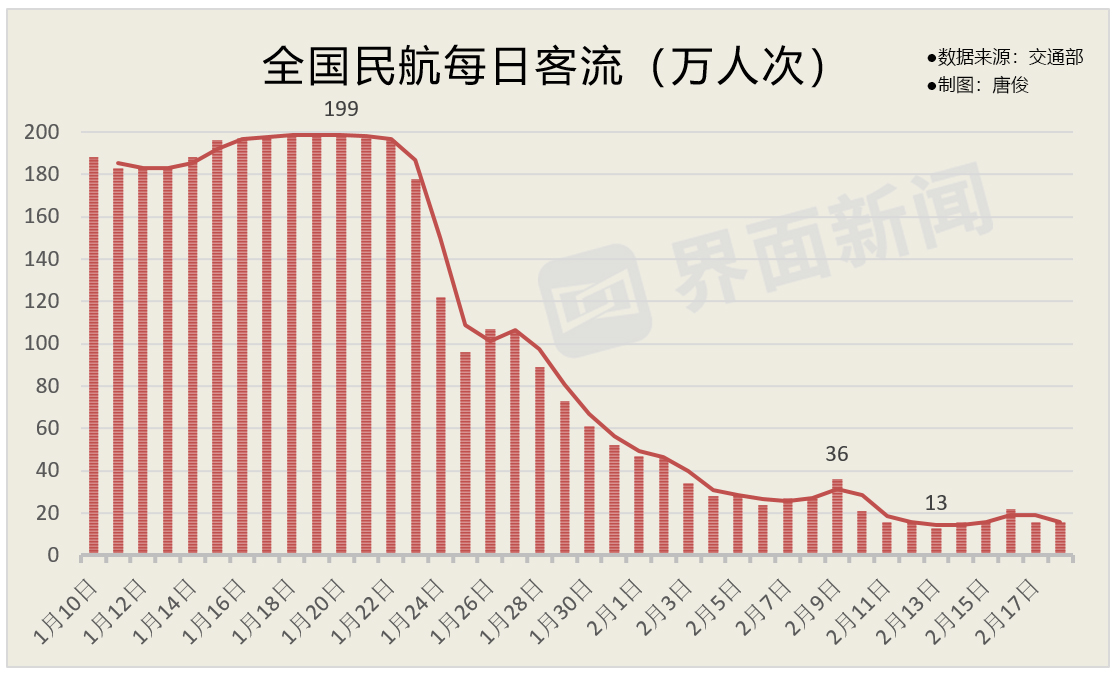 春运期间,民航客流最高峰出现在1月20日,达到199万人次;最低谷出现在2月13日,客流为13万人次。40天的春运中,民航客流有15天的降幅超过80%,其中7天降幅超过90%。