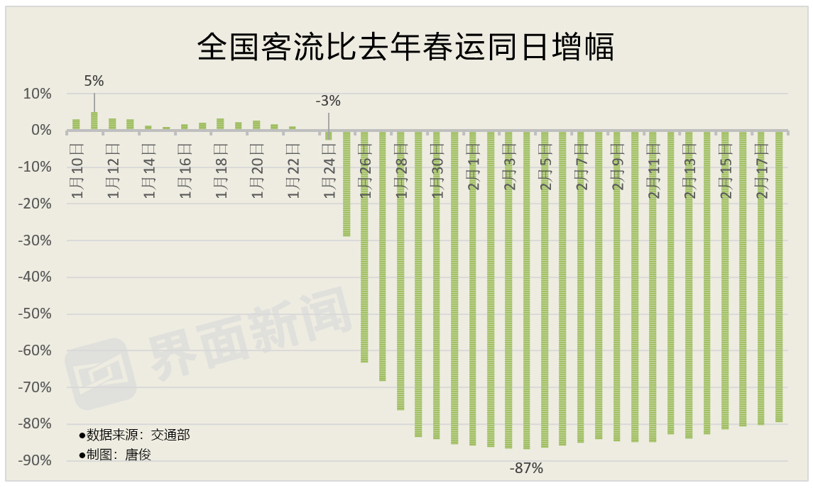 之后,随着疫情更加严重,政府部门倡导公众减少出行,铁路、民航、公路运输企业相继推出免费退票措施,全国客流进一步下降,1月26日降幅首次超过6成(注:对比口径为去年春运同期,下同);1月29日同比降幅超过八成,达到83.5%,此后降幅一直保持在80%以上。2月4日(正月十一)客流降幅为整个春运期间最大,达到86.8%。