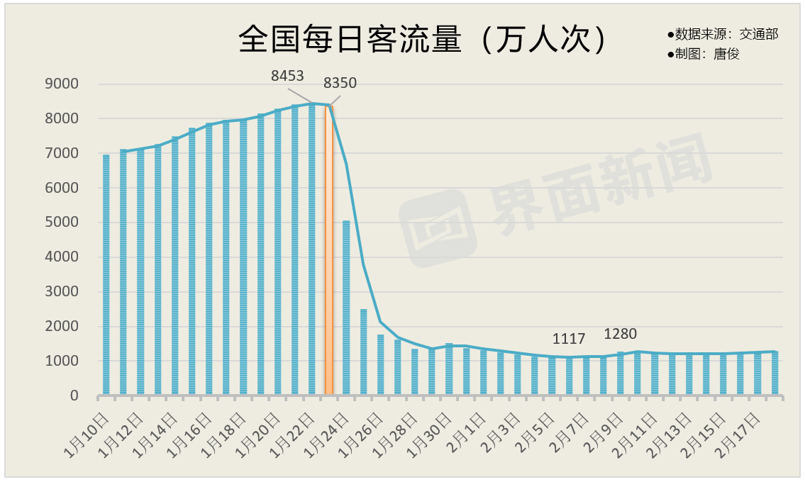 从1月10日到1月22日,春运前半程基本保持了大客流的状态,同比还有所增长。1月23日凌晨,武汉宣布“封城”后,公众对疫情重视程度迅速提高,全国客流遭遇拐点,23日、24日的客流相比去年同期均出现下降。