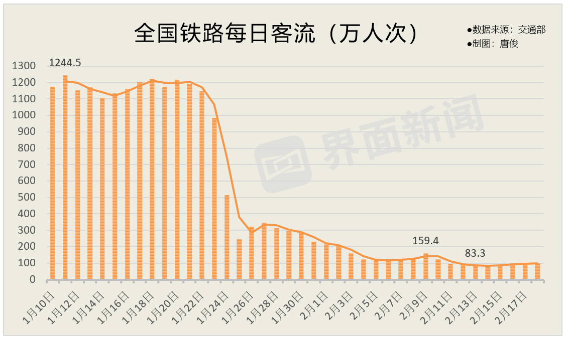 铁路客流的最高峰出现在1月11日,达到1244.5万人次;最低谷出现在2月13日,客流为83.3万人次。