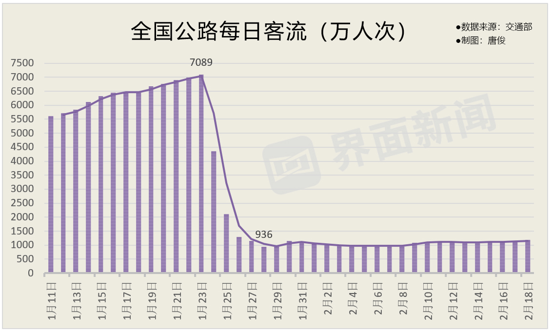 公路方面,春运期间共发送旅客12.11亿人次,同比下降50.8%。全国高速公路网监测数据显示,2月9日以来,高速公路日均车流量为599.65万辆次,只有去年同期的1/4。