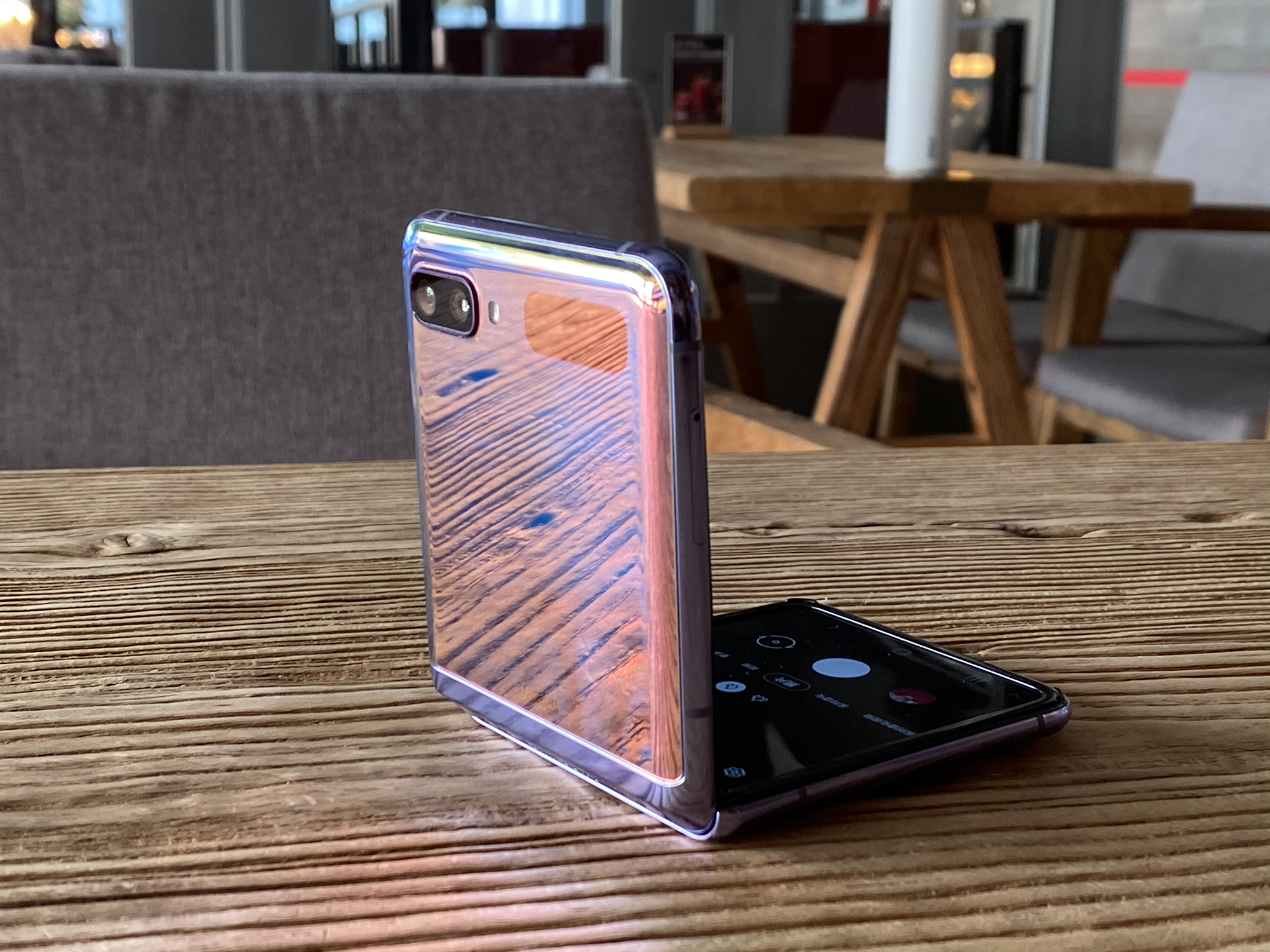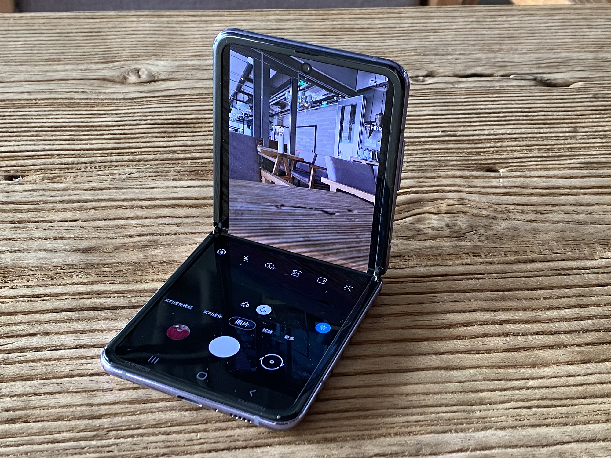 Galaxy Z Flip在打开相机后可以将手机弯着为90度,形态类似一个笔记本,屏幕的上半部分是取景框,下半部分则是可以切换拍摄方式的触摸板。