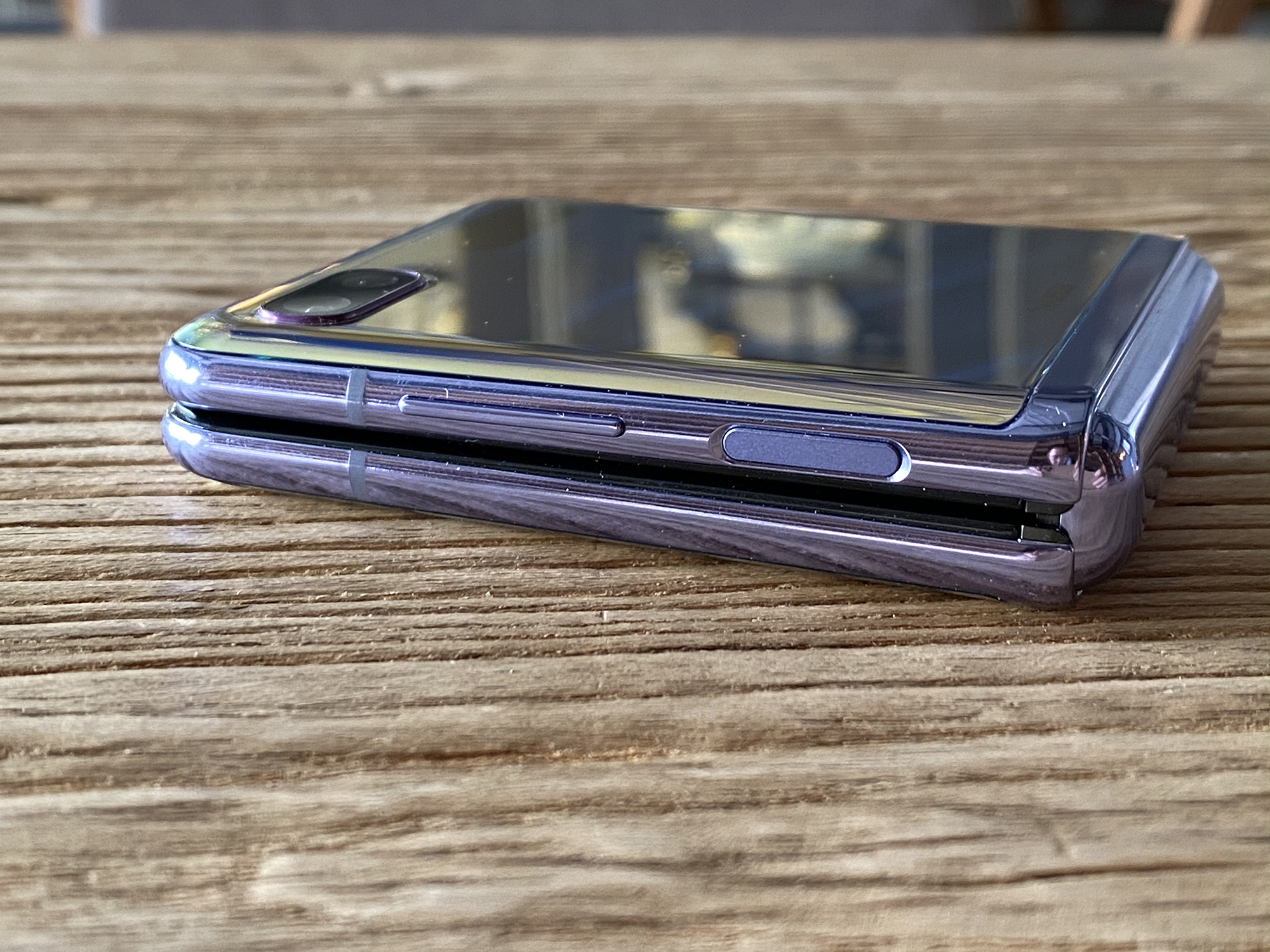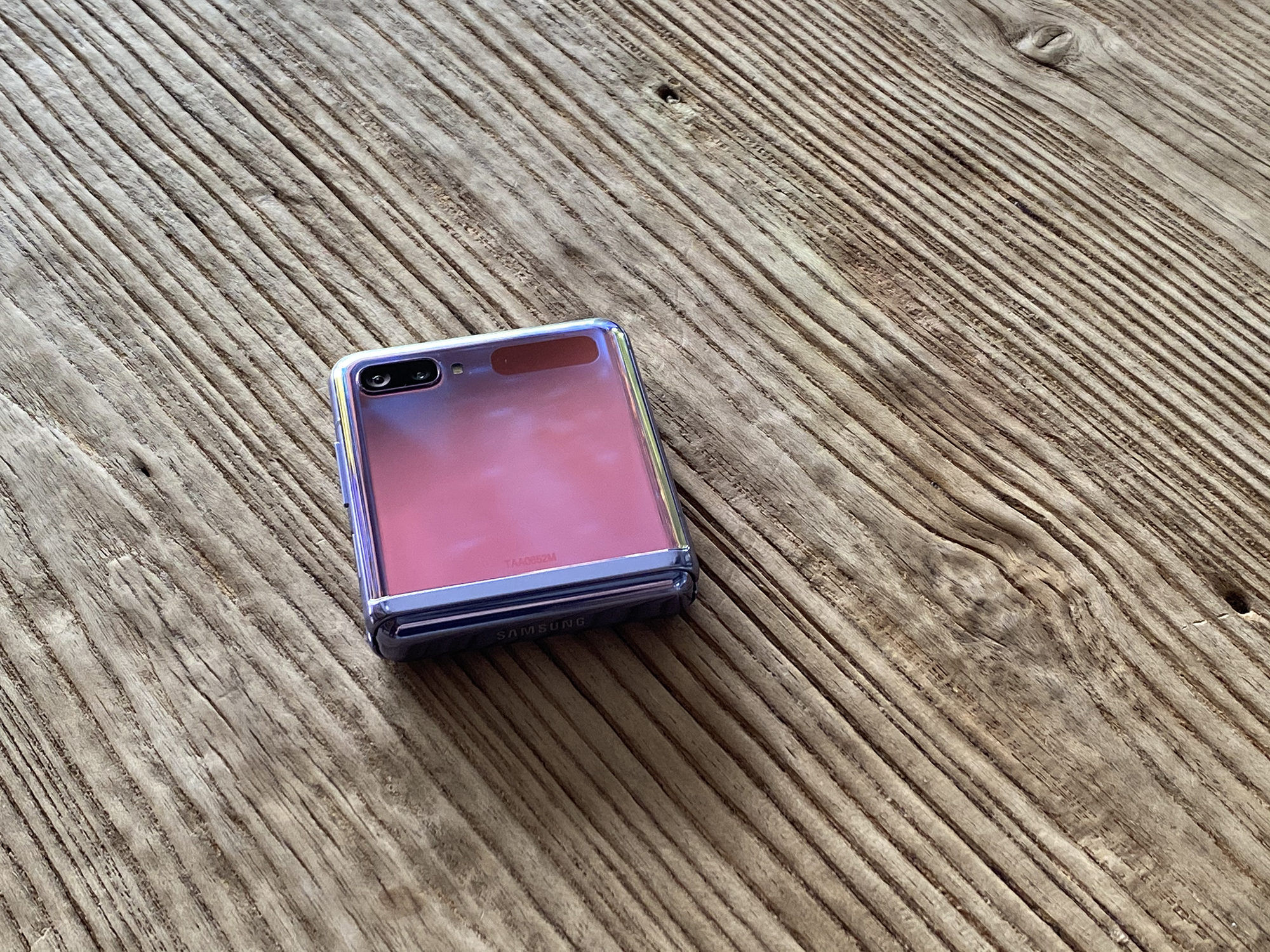 Galaxy Z Flip展开状态下就如同一台常见的智能手机,6.7英寸居中挖孔屏,Dynamic AMOLED面板分辨率2636×1080。因折叠的缘故边框比较明显,同时覆盖了一层超薄玻璃进行保护,而在上下折叠后就变得较为小巧。