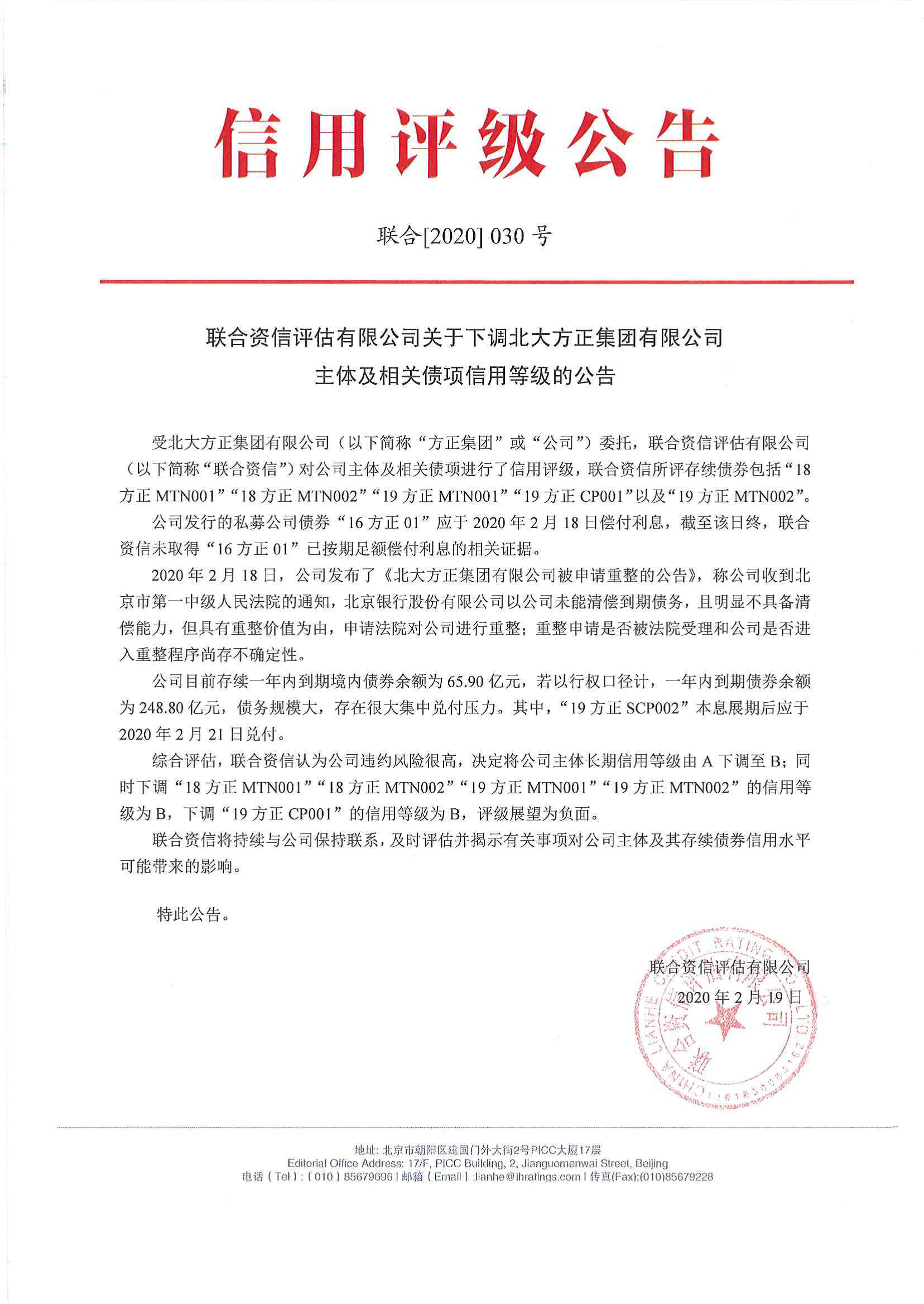 联合资信称“公司违约风险很高,决定将公司主体长期信用等级由A下调至B;同时下调‘18方正MTN001’、‘18方正MTN002’、‘19方正MTN001’、‘19方正MTN002’的信用等级为B,下调‘19方正CP001’的信用等级为B,评级展望为负面”。