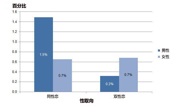 该研究抽查上千名英国民众后发现,1.1%的成年人认为自己是同性恋,0.5%认为自己是双性恋,但后者在不同性别中却有较大差异。其中,0.7%的女性称自己为双性恋,而男性中只有0.3%。