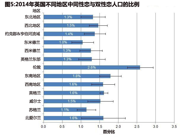其他来自英国国家统计局的数据显示,与英国其它地区,尤其是与苏格兰相比,伦敦居民身为同性恋与双性恋的可能性更大——2.3%的伦敦居民认为自己是同性恋或者双性恋。同时,认为自己是同性恋的伦敦女性比例同为0.7%,但自认为同性恋的男性比例则是双性恋的五倍。更多结果请看下图:
