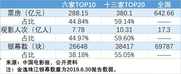 这些院线来头很不小,依据中国电影报2019观影人次前20排名,这22家中有6家排名TOP10,13家排在TOP20。如上表所示,仅在前20之内的13家院线,票房收入及观影人次在全国占比均接近六成。