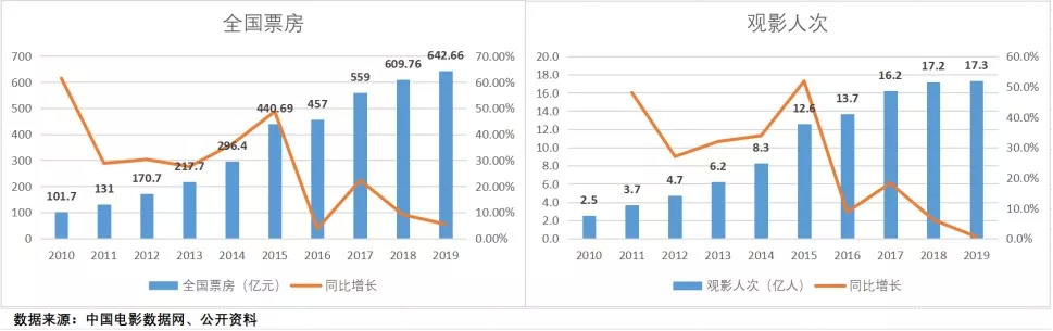 中国电影产业过去十年都处在高速发展期。全国票房从2010年的101.7亿增加到2019年的642.66亿,全年观影人次从2.5亿增长到17.3亿。