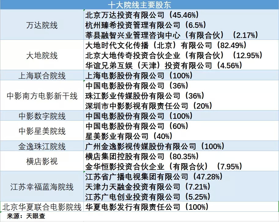这也就是为什么会出现院线对线上放映的抵制,主要院线的大股东们都是电影圈子里的巨头,以前行业规则的制定者,可以说非富即贵。中国电影股份有限公司是三家院线的第一大股东,同时是华夏联合第二大股东;江苏幸福蓝海和北京华夏联合第一大股东是广电;上海联合由国资委绝对控股;其他院线背后股东也都实力强劲,万达院线背后是王健林的万达,大地院线控股股东大地时代文化,金逸珠江、横店影视均是上市公司。